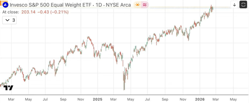 Cava matiza que el sentimiento es alcista pero no extremo, lo que permitiría al S&P 500 seguir subiendo “no mucho”, antes de formar un techo cuando el optimismo alcance niveles exagerados. Explica que el mercado está dividido: los “7 Magníficos” están lastrados por la debilidad del software y mantienen al índice lateral en torno a 7.000 puntos, mientras que el ETF equiponderado Invesco S&P 500 Equal Weight (RSP) marca máximos históricos. Sin los grandes valores tecnológicos, el mercado mostraría una clara tendencia alcista.
