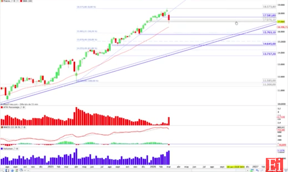 En datos semanales, el IBEX 35 ha tenido una semana con un impacto relevante en el muy corto plazo. En estos momentos el principal indicador bursátil de la renta variable española cotiza en los 17.250 puntos, lo que supone, respecto al cierre del pasado viernes, una corrección del 6,05%. La semana arrancó además con un importante hueco bajista, concretamente del -2,89%, perforando ya en la apertura primeros soportes relevantes: por un lado, la directriz creciente que parte de los mínimos de comienzos de abril de 2025 y, por otro, el último mínimo creciente situado en los 17.581 puntos.