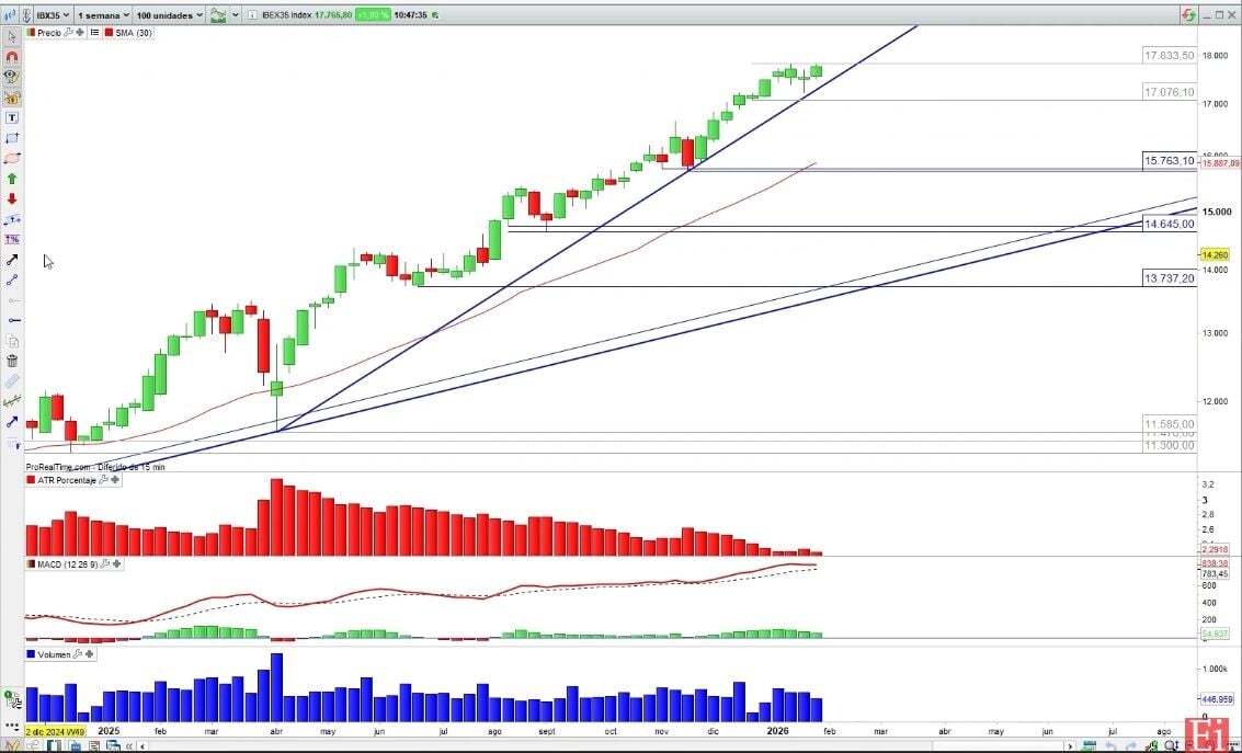No obstante, "el oscilador MACD continúa, una semana más, en niveles de extrema sobrecompra. Esta circunstancia podría dificultar la extensión del impulso alcista en las próximas semanas si la sobrecompra se mantiene en los niveles actuales. Por ello, será importante vigilar una posible perforación de soportes que dé lugar a una fase de consolidación en el IBEX 35. Aun así, mientras el precio se mantenga por encima de los soportes actuales, seguiremos manteniendo una visión positiva, sin descartar incluso la posibilidad de que el índice logre cerrar por encima de los 17.833,50 puntos y nos ofrezca señales de continuidad alcista para las próximas semanas".