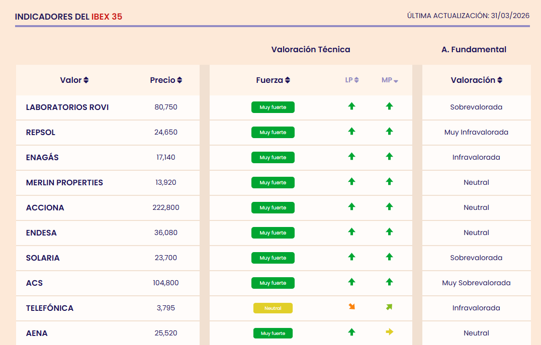 Dentro del actual Ibex 35, según los indicadores premium de fuerza y tendencia, podemos ver los valores que están muy fuertes y además tienen tendencia alcista a largo y medio plazo, así como su valoración fundamental.