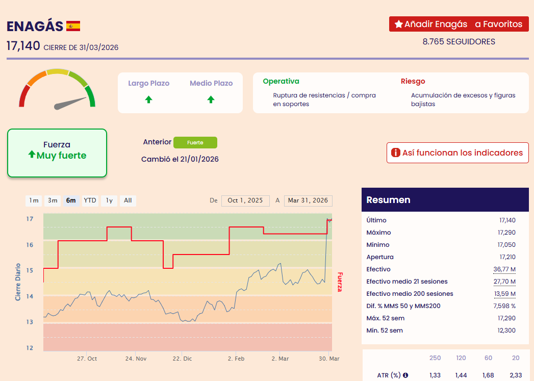 Fíjense por ejemplo en Enagás, el pasado 9 de octubre, el indicador ( color rojo) pasó de estar neutral a fuerte, y desde ese día, el valor ha pasado de cotizar de 13.6 euros la acción a 17.14, Es decir el valor ha subido un 26% en bolsa.