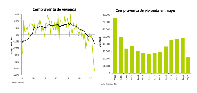 La compraventa de vivienda cayó con fuerza en mayo: tan solo 22.394 operaciones, el peor mes de mayo en la serie disponible desde 2007, y menos de la mitad de las operaciones que se registraban hace un año (48.351 en mayo de 2019). Cabe recordar que el estado de alarma estuvo vigente durante todo el mes de mayo, con la población confinada en sus hogares y los colegios de registradores cerrados al público, solo registrando las operaciones por causas de fuerza mayor o de necesidad. Por tanto, se trata de un indicador retrasado: la intensificación de la caída respecto a marzo y abril no refleja un deterioro adicional de la demanda, sino que, simplemente, esas operaciones por fuerza mayor son cada vez menores.