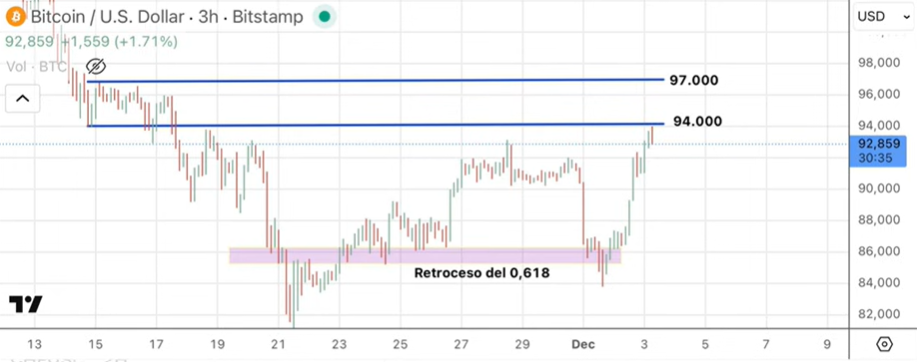 Explica que Bitcoin retrocedió “el 0,618” del tramo del 21 al 28 de noviembre, hizo “un escape falso a la baja” y formó “una figura de cabeza a hombros invertida”, lo que originó la subida violenta. Señala la resistencia en 94.000–97.000 y la siguiente en 107.500–106.400.