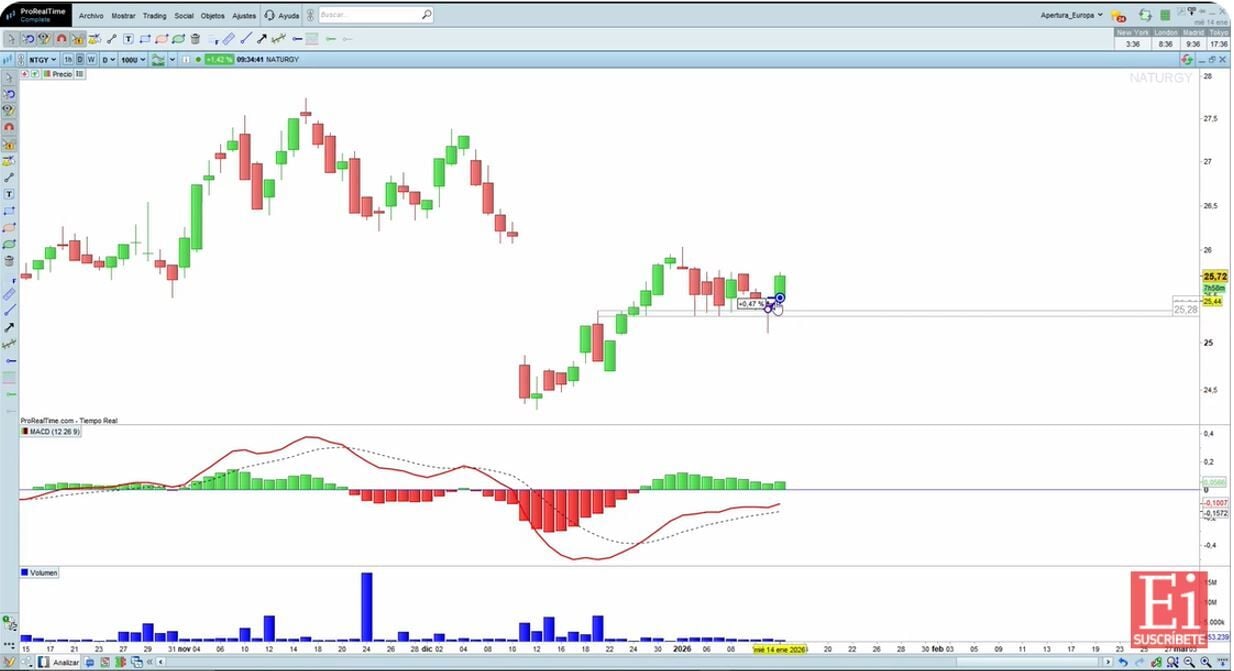 Para el analista de mercados financieros, José Antonio González, las acciones de Naturgy, ayer desarrollando vela martillo en zona de relevancia técnica, en zona de anteriores techos luego soportes, tuvimos dilatación bajista, para luego recuperar evitando de esta forma cierres por debajo de los 25,28 euros por acción.