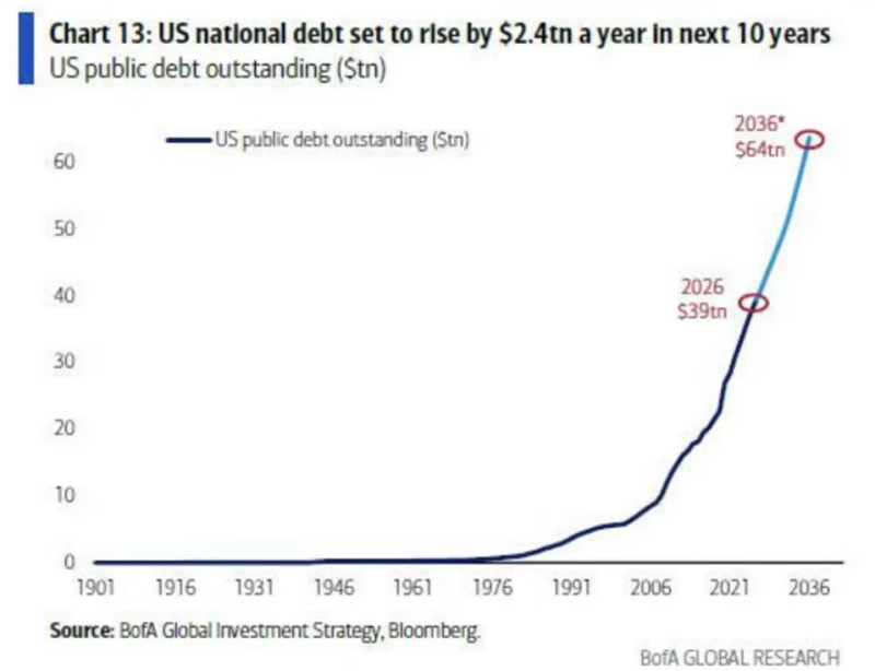 Además, Bank of America prevé que la deuda pública aumente de 40 a 64 billones de dólares en los próximos diez años. Pero es que además la deuda per cápita sigue una tendencia claramente acelerada.