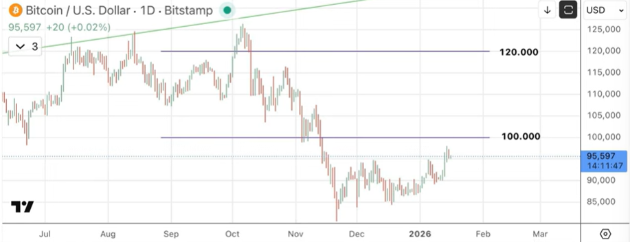 Indica que hay “10.000 millones de dólares” en opciones abiertas en esa zona y que el “tapón” podría desaparecer con las expiraciones del 16 y, sobre todo, del 30 de enero. Tras ello, considera probable que las nuevas calls se vendan en torno a 120.000, lo que abriría “camino al alza” hacia ese nivel.