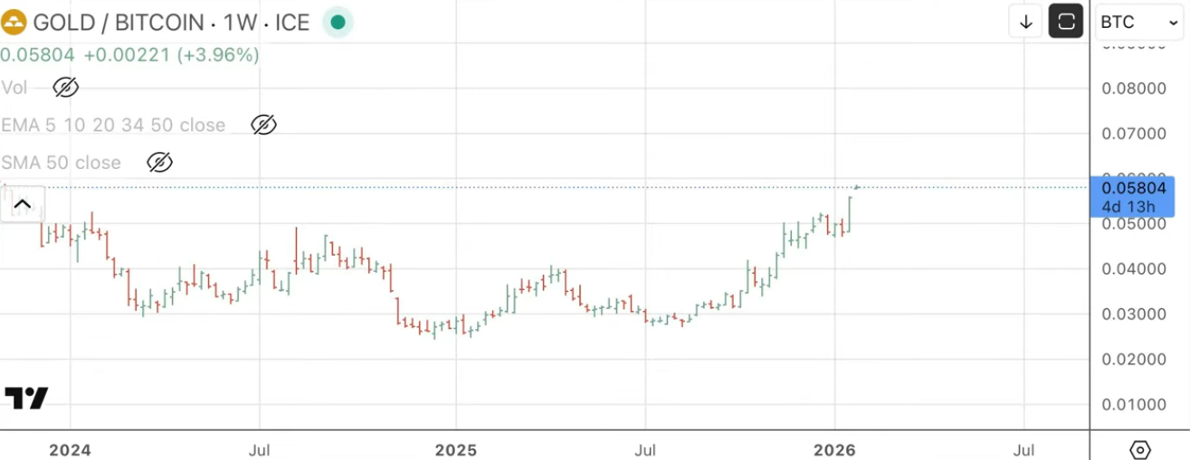 Relacionándolo con Bitcoin, el experto explica que el oro sube por “la degradación monetaria” y un sistema roto, mientras que Bitcoin, pese a tener una “correlación muy alta” con el oro a largo plazo, está lastrado a corto plazo por la subida del metal y por la venta de opciones call por parte de las ballenas. A largo plazo, sostiene que “la degradación monetaria tiene que hacer que la cotización de Bitcoin suba”.