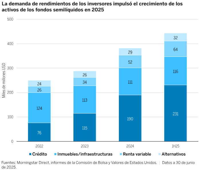 Otro ejemplo de esta tendencia son los llamados fondos de intervalo, cuyos activos crecieron hasta los 450.000 millones USD a mediados de 2025, un 16% y un 77% más respecto al cierre de 2024 y de 2022, respectivamente2. Las estrategias de crédito siguen siendo la asignación más popular de estos instrumentos de inversión, mientras que los activos de los fondos de crédito semilíquidos han aumentado a 230.000 millones USD, o un 22%, desde el cierre de 2024 (Figura 3). Estos fondos han brindado históricamente rendimientos más elevados que la renta fija cotizada, al combinar préstamos a tipo variable con apalancamiento. Ante el actual entorno monetario, conviene recordar que los bonos a tipo variable remuneran en función de un diferencial sobre los tipos de interés a corto plazo y, por lo tanto, los rendimientos aumentan cuando esos tipos son altos y caen cuando son bajos.