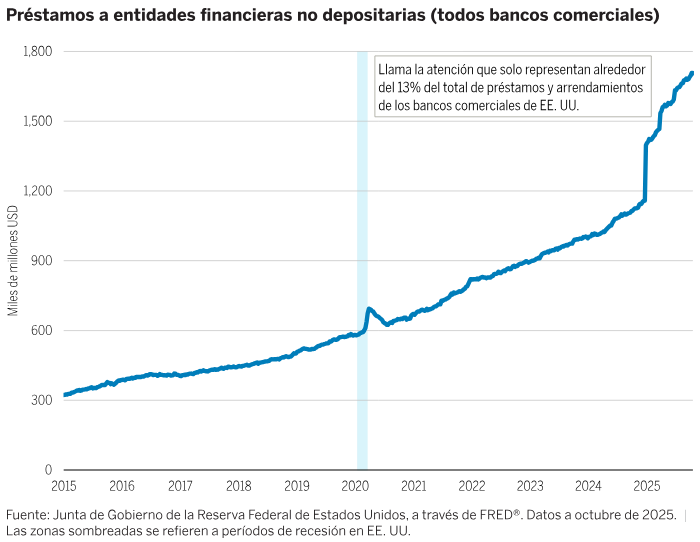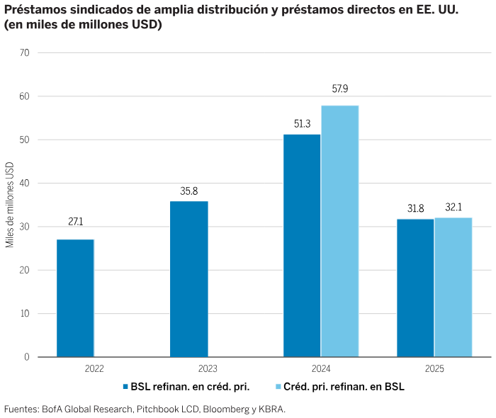 Un cambio de tendencia en favor de los préstamos de mercado. De forma creciente, los bancos optan por asociarse con gestores de crédito en lugar de participar directamente del riesgo en sus balances. La robustez de la estructura de capital. A diferencia de lo que ocurrió en ciclos anteriores, una buena parte del apalancamiento adicional recae en los prestamistas privados en lugar de en los bancos con bases de depósitos, y ello reduce la vulnerabilidad del sistema.