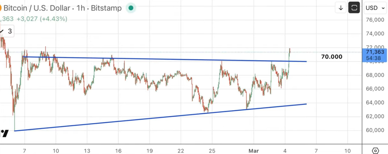 Bitcoin intenta consolidar por encima de 70.000; si lo logra, podría ir hacia 75.000, apoyado en niveles de miedo elevados. El ETF HYG perforó soporte pero lo recuperó, señal que le hace pensar que “la situación… se está estabilizando”.