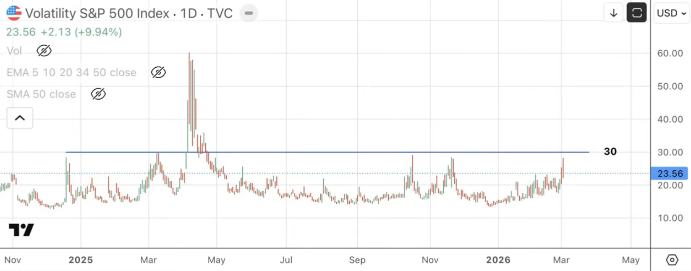 ¿Es una oportunidad de compra? Cree que sí, porque los factores negativos serían temporales, la economía crecería a ritmo sólido y los beneficios avanzarían en torno al 15%, siempre que el bono no supere 4,30%. No obstante, el índice de miedo y codicia de CNN está en “miedo”, no en “miedo extremo”, por lo que podría faltar una última caída. Para confirmar suelo exige capitulación: VIX en 40–50. Como eso no ha ocurrido, el suelo “todavía no ha llegado”, aunque estaría cercano.