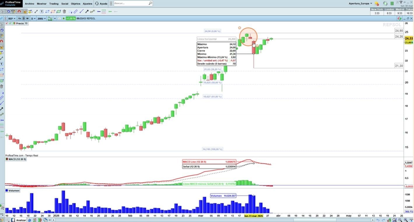 Álvaro Nieto, analista de mercados de Estrategias de Inversión, destaca que las subidas están intentando neutralizar el hueco bajista que se abrió en la sesión del pasado lunes 23 de marzo, por lo que nos encontramos ante una jornada importante, en Repsol.
