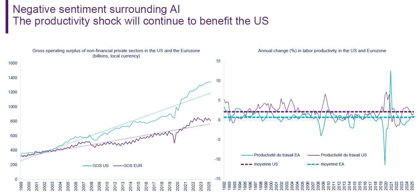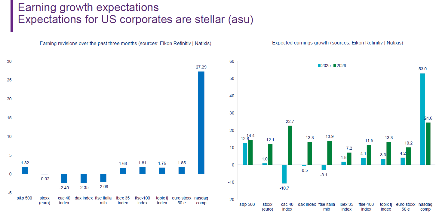 Con estas líneas base, Natixis Investment Managers aflora un primer diagnóstico en bolsa: Estados Unidos seguirá teniendo ventaja sobre Europa en 2026, tanto por el comportamiento de su economía como por la evolución de su mercado de renta variable. “Se mantiene la tendencia al alza en las expectativas de crecimiento en EEUU. De hecho, el pasado miércoles la Fed ya avanzaba que el PIB crecerá un 2,3% en 2026. Mientras, en Europa será del 1,1%", señala Mabrouk Chetouane, Global Head de Estrategias de Mercado de Natixis.