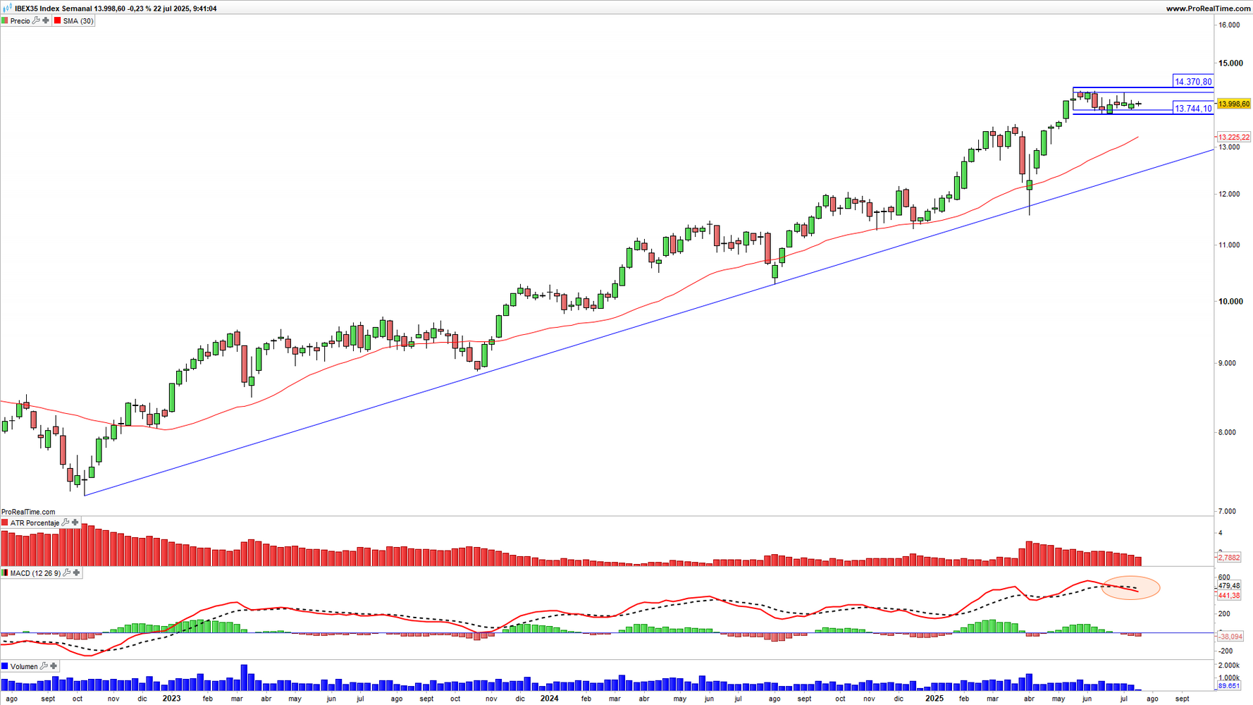 En el gráfico semanal del IBEX 35 (IBX35), observamos lo saturado que se encuentra el mercado español en estos momentos, con el oscilador MACD situado en niveles de sobrecompra no vistos durante los últimos años. De este modo, el oscilador ya presenta cortes descendentes, por lo que consideramos con buenos ojos el proceso de consolidación que se está produciendo durante las últimas semanas, completando el precio la formación de un rango lateral comprendido entre los 13.744 y los 14.380 puntos.