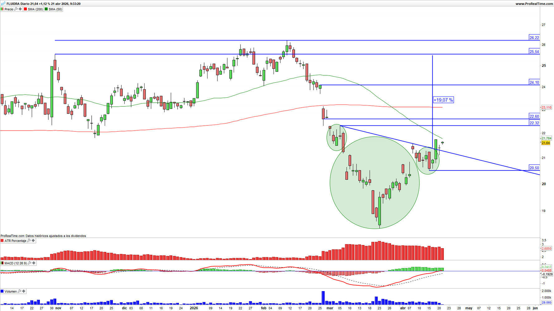 En definitiva, mantendremos una perspectiva muy positiva para las acciones de Fluidra siendo muy importante que no se registren precios de cierres diarios inferiores a los 20,50€ por acción ya que la ruptura de este nivel anularía el objetivo alcista que se mantiene activo.