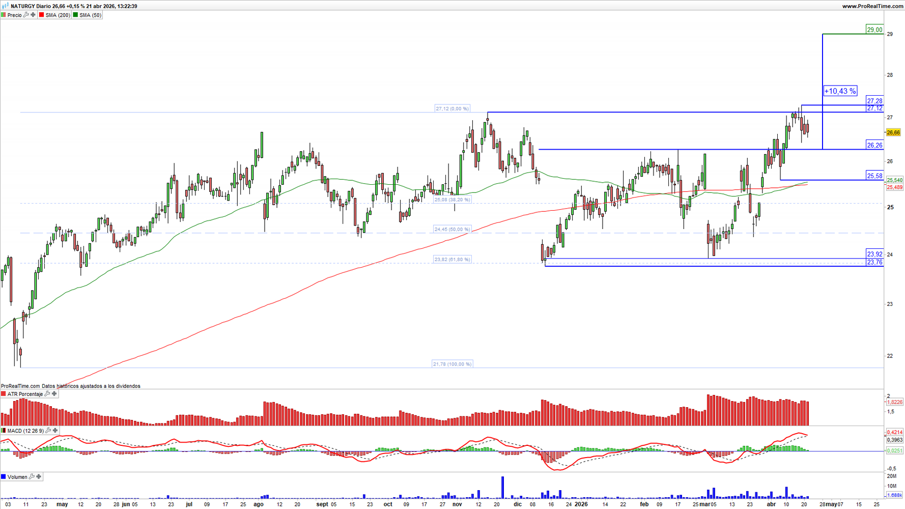 Naturgy (NTGY) en escala diaria con volatilidad (gráfico central superior), MACD (gráfico central inferior) y actividad de contratación (ventana inferior). Fuente: ProRealTime y elaboración propia.