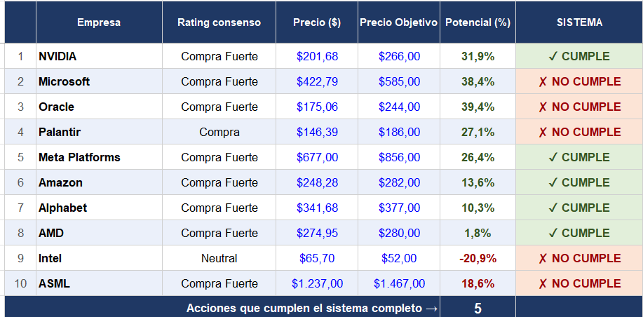 Claramente Nvidia, Meta, Amazon, Alphabet y AMD son valores que están para comprar y con un potencial en bolsa algunos de ellos muy fuerte (Nvidia y Meta por encima del 25%).