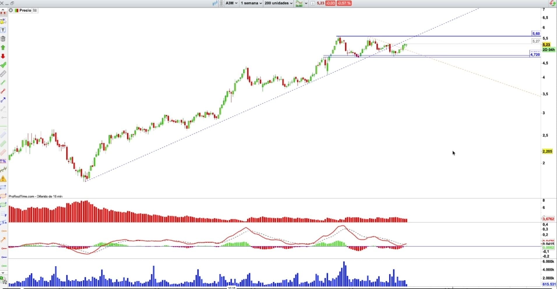 Atresmedia, por su parte, después de haber tenido un gran movimiento alcista, se encuentra actualmente en un rango lateral, pero encontrando apoyo en la vela tipo martillo. Un cierre de la banda semanal del 5,27 euros tendría sentido que fuese a la banda superior del rango lateral.