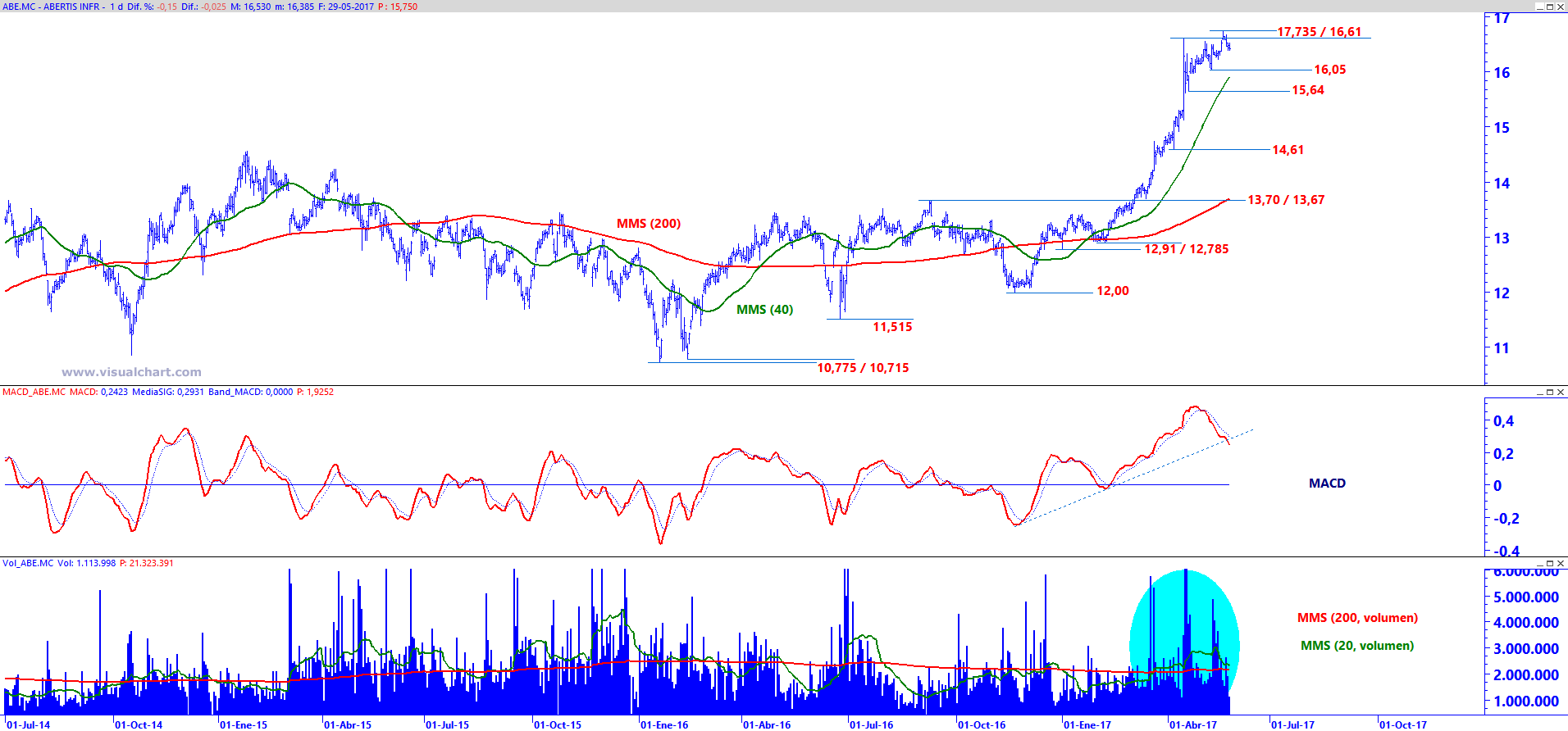Abertis en gráfico diario (ventana superior) con MACD (ventana central) y volumen de negociación (ventana inferior)