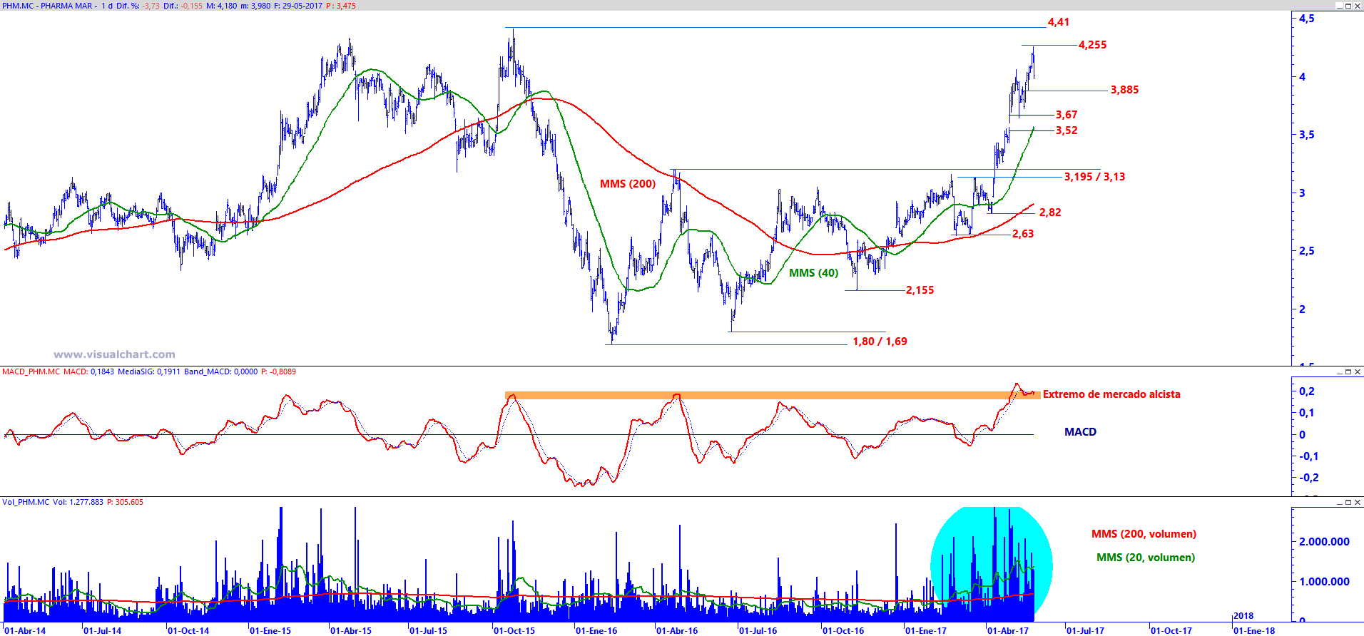 Pharma Mar en gráfico diario (ventana superior) con MACD (ventana central) y volumen de negociación (ventana inferior)