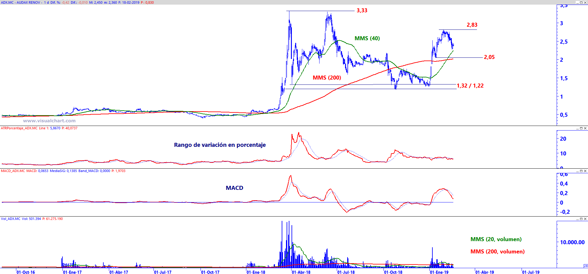 Hola, quisiera saber si conviene entrar en Audax y a qué precio. Las últimas noticias de la acción no le han dado fuerza desde la resistencia en torno los 2,83. Gracias.