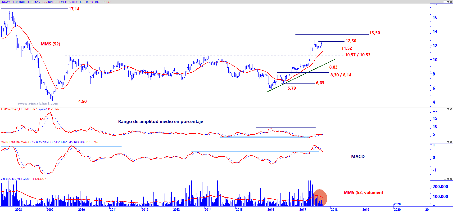 Elecnor se encuentra en pleno proceso de normalización de lecturas de sobrecompra que podemos identificar, en escala temporal semanal, en el oscilador MACD. Ello se produce tras un violento avance hasta los máximos anuales de los 13,50. Dicho proceso de normalización se registra con una caída significativa en el volumen de contratación, por lo que las caídas de momento no suponen una amenaza real para la estrcutura creciente de largo plazo, proceso por tanto que consideramos saludable y que permitirá la entrada en largo a precios más competitivos y saneados. En este sentido, al corto plazo se encuentra atacando el soporte de los 11,52 que, de ser perforados a cierre semanal, habilitaría un potencial a la baja rumbo a los 10,57 / 10,53, cota que aprevecharíamos para buscar una potencial reincorporación en largo. Para inversores con menor aversión al riesgo, los actuales niveles y la vela desplegada hoy, registrando una contundente sombra inferior desde zona de soporte permite posicionarse de cara a buscar una superación de los 12,50, aunque este escenario presenta mayor riesgo al no haber normalizado por completo las lecturas de sobrecompra acumulada.
