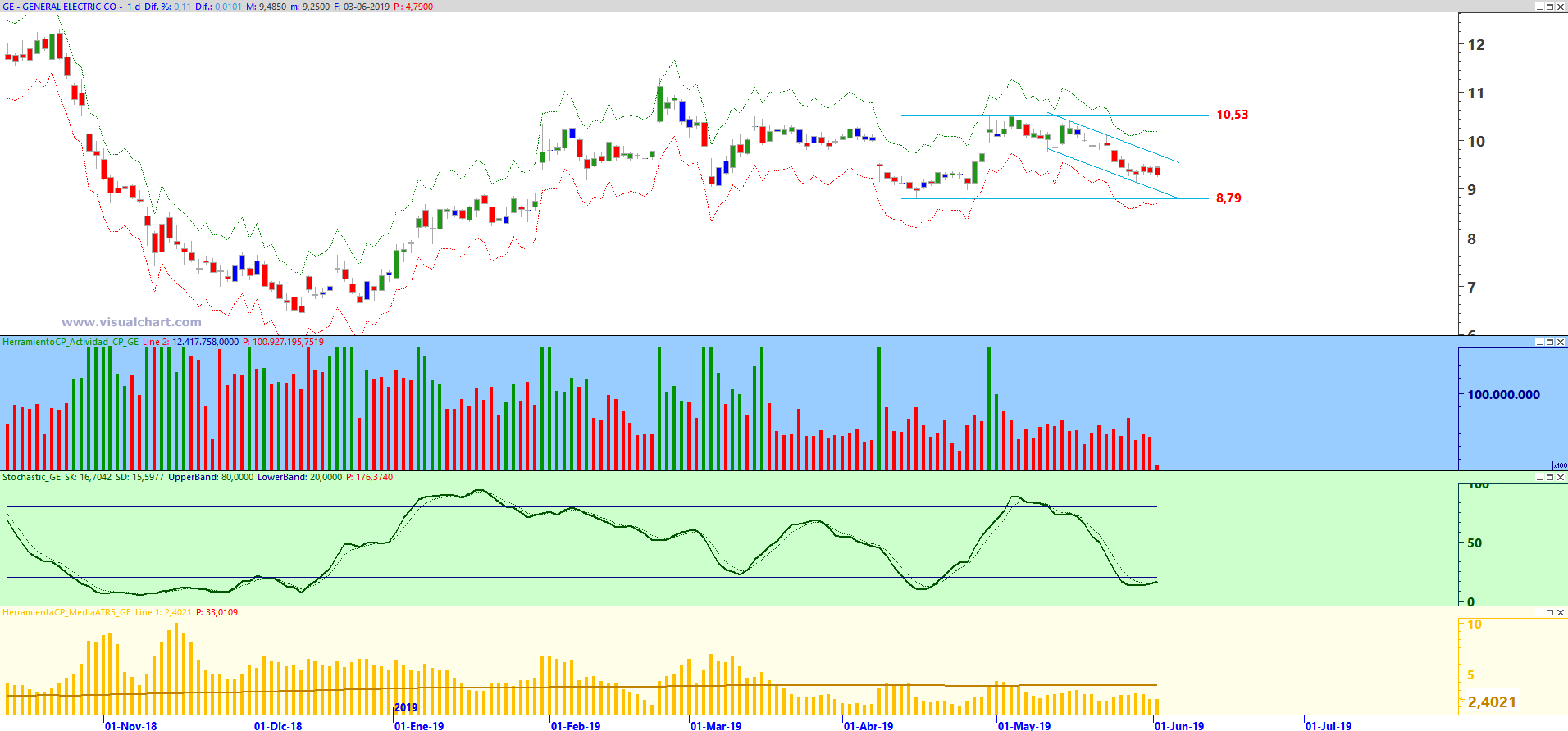 General Electric desarrolla un proceso de canalización decreciente en el corto plazo, acumulando una serie de velas rojas consecutivas que, en el corto plazo, denotan dominio de las ventas. En este sentido, la cotización se aproxima a la zona de soporte que identificamos en los 8,79, que es el soporte secundario o de medio plazo más próximo y que funciona como la banda inferior de negociación de un proceso lateral vigente a lo largo de los últimos meses. Por ello, las perspectivas no son muy halagüeñas y no asistiremos a cambios significativos al alza mientras la cotización permanezca por debajo de los 10,53.