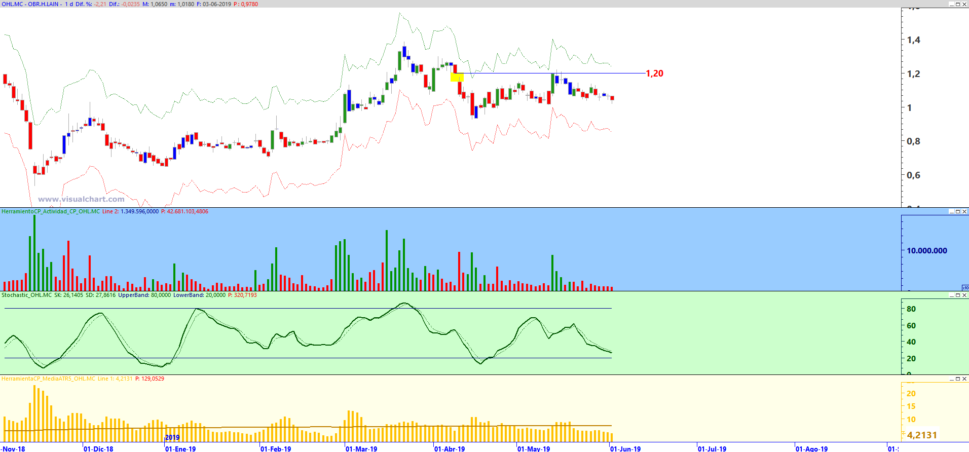 A corto / medio plazo, ni OHL ni DIA son atractivas desde un punto de vista tendencial. Entre las dos, las que más atractivo presenta a día de hoy es OHL, pero todavía insuficiente para pensar en la toma de posiciones largas o de compra mientras su cotización se mantenga por debajo de los 1,20, que es la resistencia que se proyecta a partir del hueco bajista abierto el 9 de ABR19 y que frenó el avance de las compras a lo largo del pasado mes de MAY19.