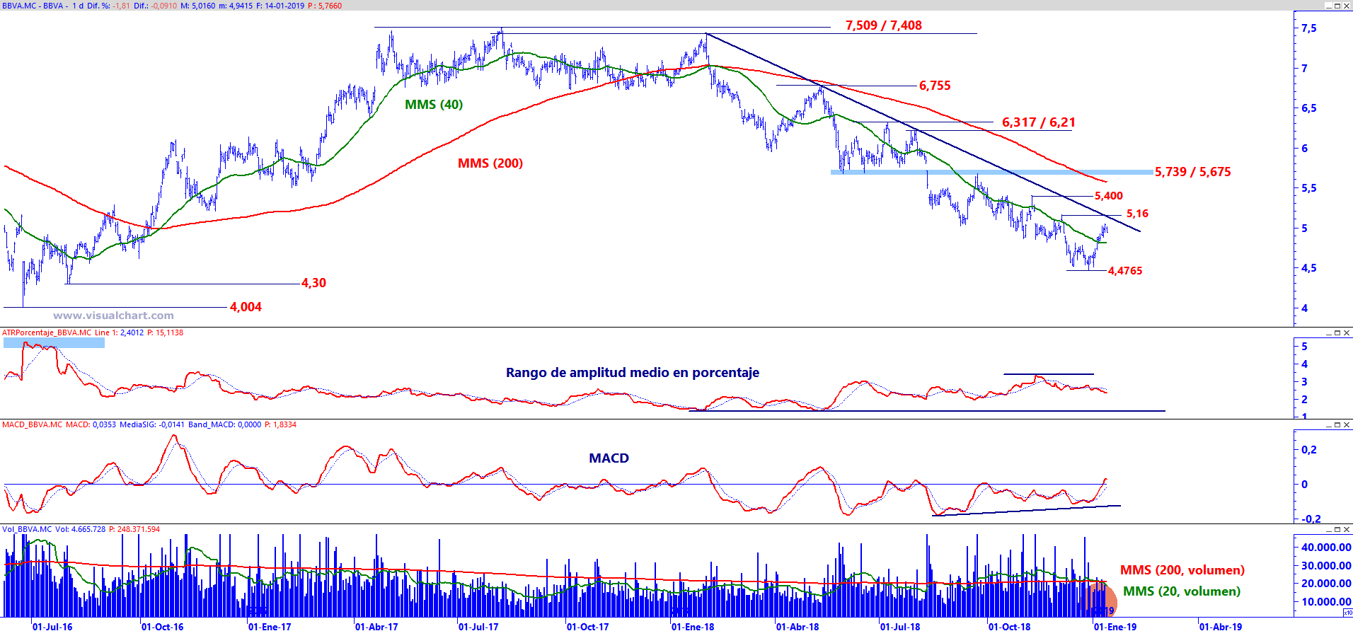 BBVA desarrolla un giro al alza a partir de los 4,4765, rebote que consigue activar señales de compra en el oscilador MACD, normalizar volatilidad, así como consolidar por encima de su media móvil simple de 40 periodos o de medio plazo. Sin embargo, el rebote no se encuentra respaldado por un volumen de contratación creciente, circunstancia que resta fiabilidad al movimiento en un contexto que mantiene vigente una incuestionable estructura de máximos y mínimos decrecientes. En este sentido, para comenzar a pensar en un suelo de mercado con el que trabajar potenciales alzas sostenidas en tiempo y forma, la cotización de BBVA debe (1) recuperar volumen de contratación y (2) consolidar por encima de 5,739 / 5,675.