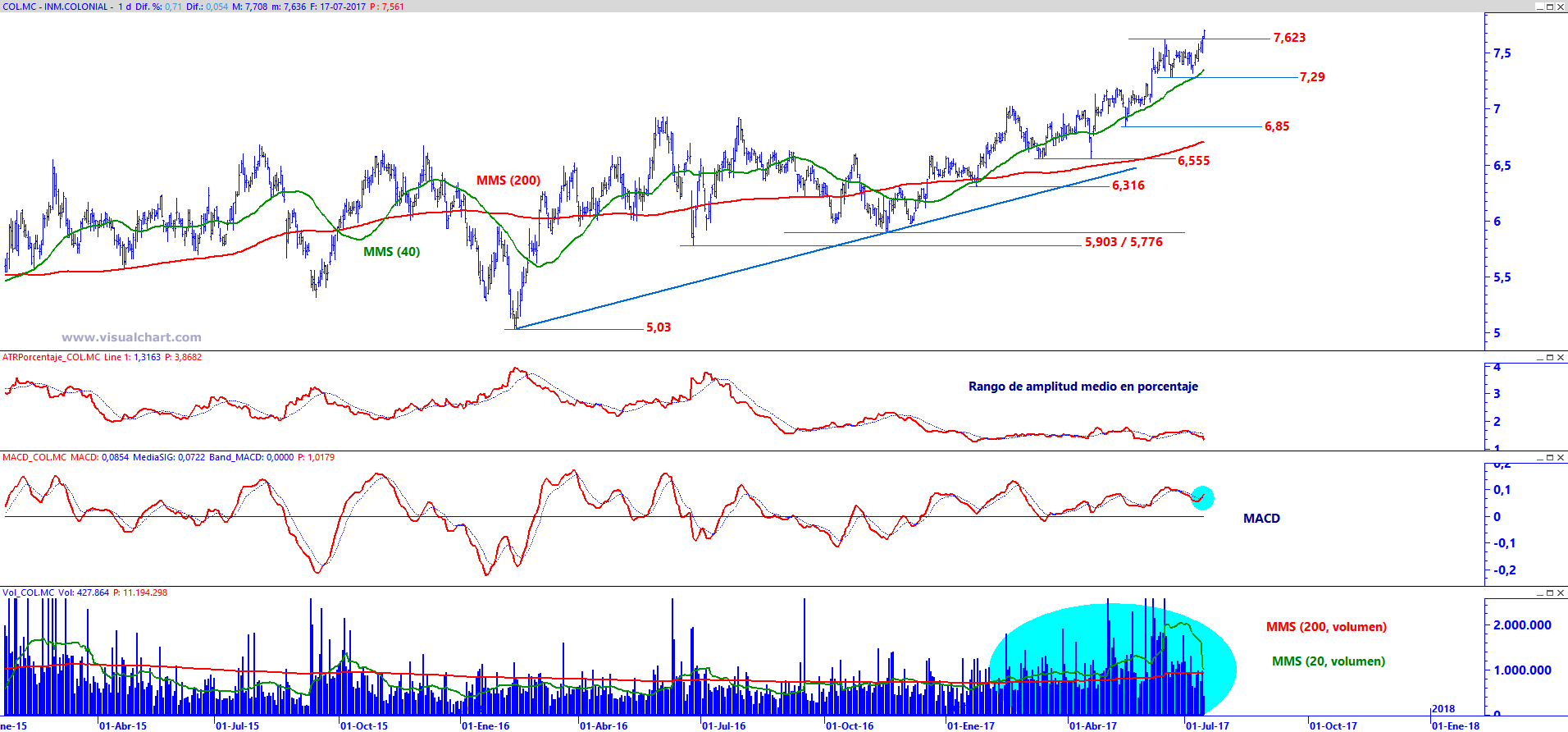 Inmobiliaria Colonial en gráfico diariocon Rango de amplitud medio en porcentaje (ventana superior) MACD (ventana central) y volumen de negociación (ventana inferior)