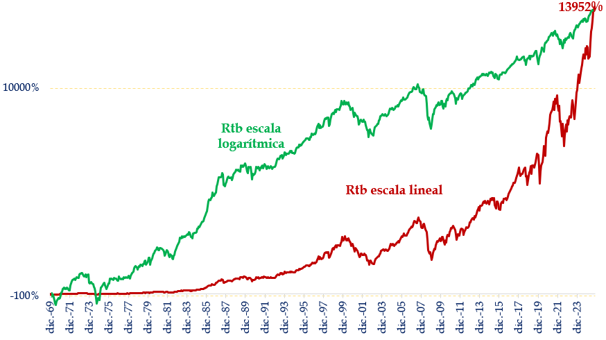 Pues bien, en una escala lineal verías la típica gráfica de finanzas que se dispara hacia arriba de forma cada vez más pronunciada, como si las rentabilidades del comienzo fueran inferiores a las del final. Pero no… En la escala logarítmica, se vería como una línea recta ascendente. El crecimiento de la rentabilidad es constante creciente, y el gráfico refleja mejor eso…