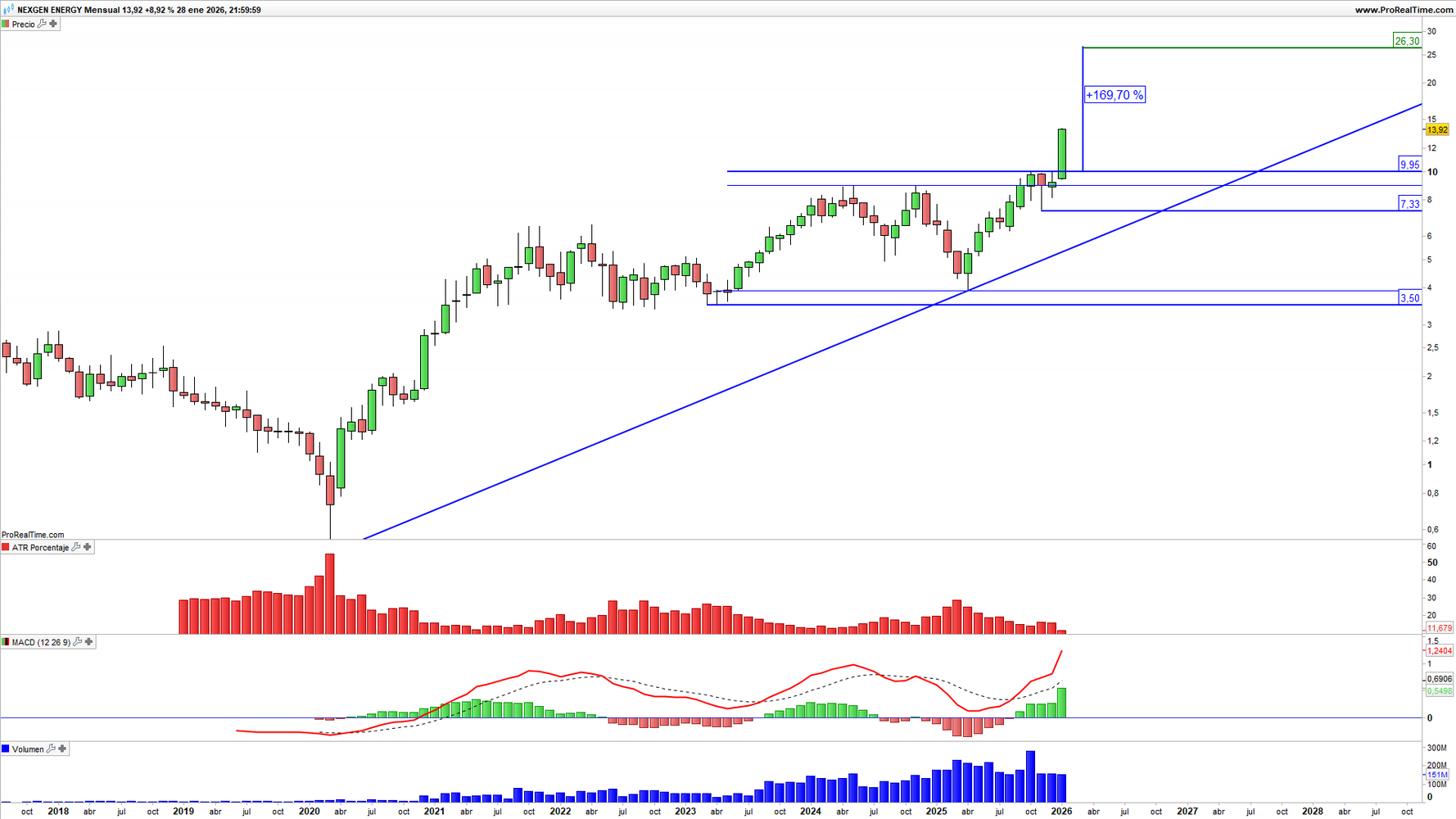 El primer activo a destacar son las acciones de NexGen Energy (NXE), donde nos encontramos que casi con toda probabilidad el precio a completar la superación de un amplio rango lateral comprendido entre los 3,50 y los 9,50$ por acción. En este sentido, la tendencia de fondo de la compañía es claramente alcista, por lo que consideramos como escenario de mayor probabilidad la continuidad de la misma. Además, el volumen de contratación se mantiene muy elevado prácticamente desde inicios del año 2025, fortaleciendo con ello la tendencia alcista de largo plazo. De este modo, con un precio de cierre mensual que es altamente probable que se sitúe por encima de los 9,50$ por acción se activará un objetivo alcista de largo plazo en las acciones de Nexgen Energy al proyectar al alza la anchura de todo el rango lateral, con una proyección de ascenso mínimo teórica de un 169,70% desde el punto de ruptura y un objetivo de