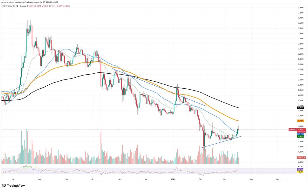 Tras la caída de febrero, XRP ha formado técnicamente una línea de soporte en ascenso gradual, lo que indica que los compradores intentan estabilizar el precio. Gracias a este movimiento alcista gradual, el activo ha podido probar los niveles de resistencia cercanos creados por las medias móviles a corto plazo, lo que le ha permitido superar el rango de soporte inmediato en torno a 1.43 dólares.