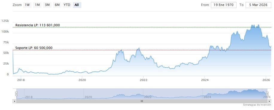 El soporte a mediano y largo plazo se encuentra en los 60.500 dólares. Mientras, los indicadores de Ei se muestran mixtos.