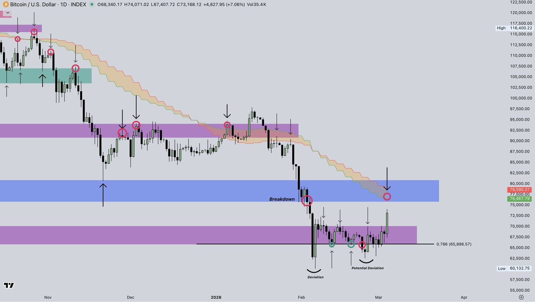 Según Luca, el nivel de confirmación clave que está observando actualmente se sitúa alrededor de los 77.000 dólares. Una ruptura decisiva por encima de ese nivel indicaría un impulso más fuerte del mercado. Por lo tanto, Luca planea reducir gradualmente sus posiciones de cobertura y reinvertir ese capital en sus posiciones al contado, anticipando un movimiento alcista más sostenible.