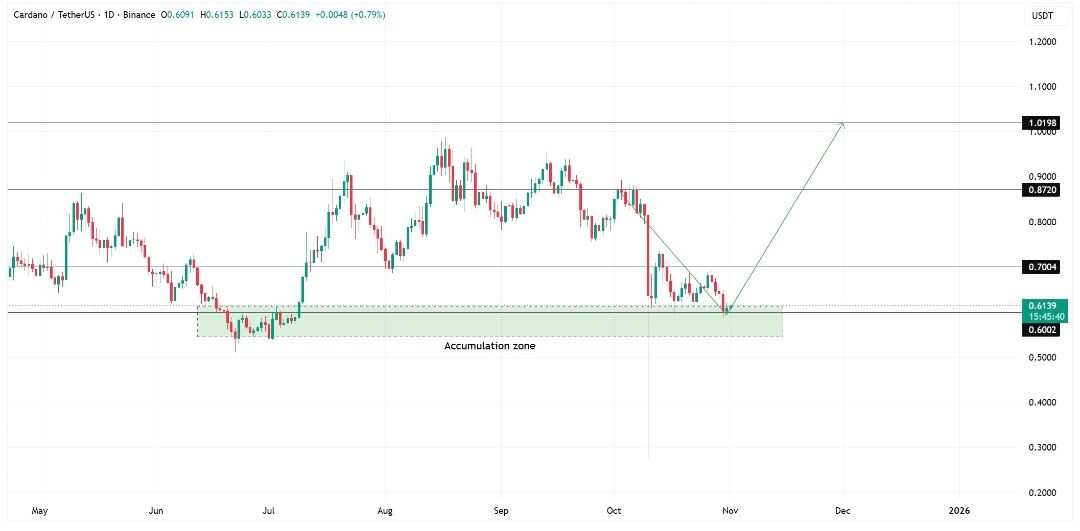 Cardano (ADA) empieza el mes de noviembre con el pie derecho al ver un aumento del interés abierto del 5%. Esto podría apuntar a un repunte hacia los 0.65 dólares, según Godfrey Benjamin en The Coin Republic.