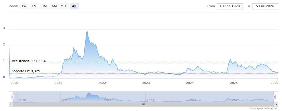 El soporte a mediano plazo se encuentra en los 0.329 dólares. Mientras, los indicadores de Ei se muestran mixtos.