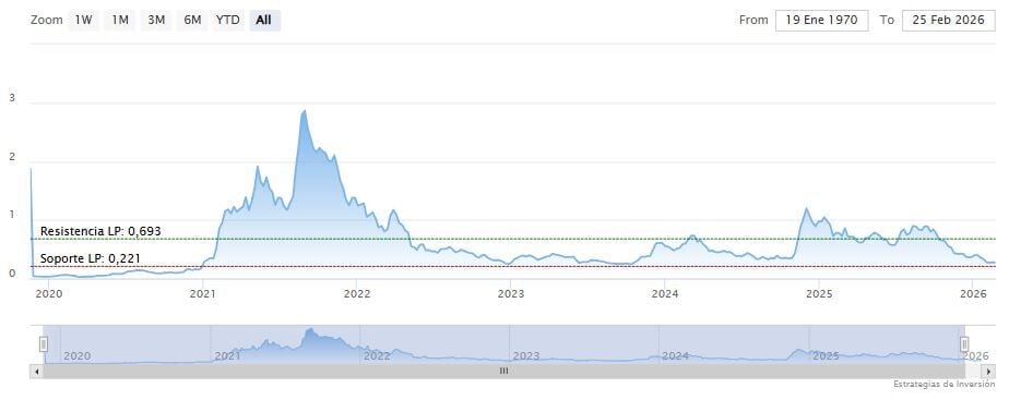 En el gráfico mensual, el activo parece estabilizarse cerca del límite inferior del rango multianual. Tras una prolongada caída desde sus máximos anteriores, la reciente reacción desde esta zona de soporte ha generado optimismo respecto a que Cardano se acerca a un punto de inflexión estructural.