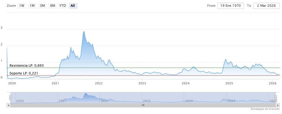 El soporte a mediano y largo plazo se encuentra en los 0.221 dólares. Mientras, los indicadores de Ei se muestran mixtos.