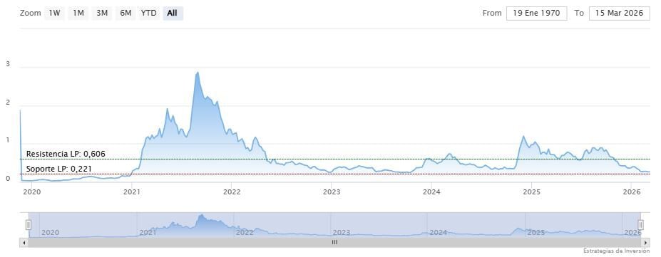 La resistencia a mediano plazo se encuentra en los 0.437 dólares. Mientras, los indicadores de Ei se muestran mixtos.