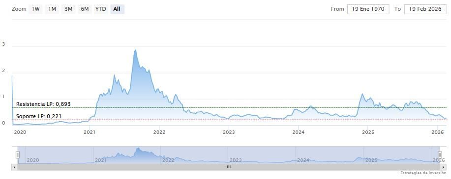 El soporte a mediano y largo plazo se encuentra en los 0.221 dólares. Mientras, los indicadores de Ei se muestran mixtos.