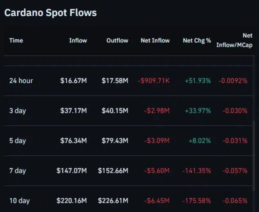 Los datos on-chain de Coinglass muestran que Cardano ha experimentado una buena actividad de compra al contado en los últimos días. Los flujos al contado muestran mayores salidas que entradas en marcos temporales más largos, lo que indica acumulación en lugar de mayor distribución.
