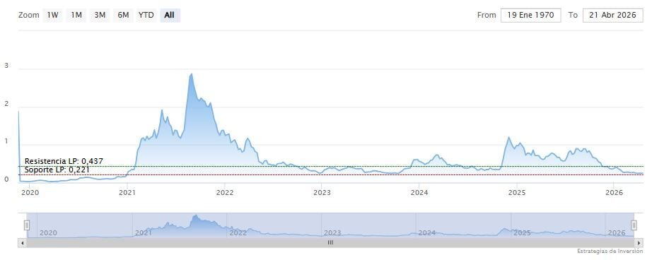 El soporte a mediano plazo se encuentra en los 0.233 dólares. Mientras, los indicadores de Ei se muestran mixtos.