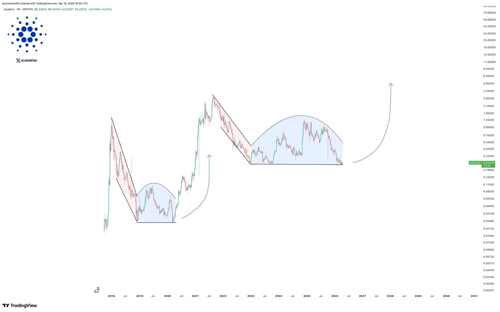 La historia no suele ser la misma, pero a veces puede rimar. Es que el crypto analista Javon Marks ha señalado en X que el gráfico actual de Cardano (ADA) muestra un escenario que podría acusar un repunte similar al del 2021 con un potencial alcista del 1.000%, según Newton Gitonga en ZyCrypto.