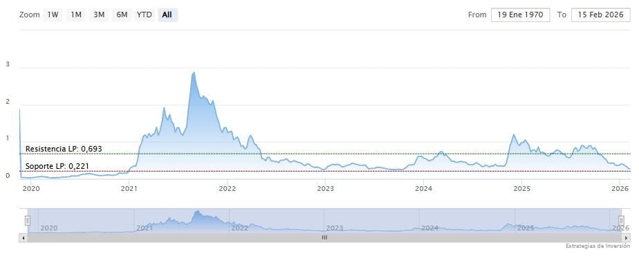 El soporte a mediano y largo plazo se encuentra en los 0.221 dólares. Mientras, los indicadores de Ei se muestran mixtos.