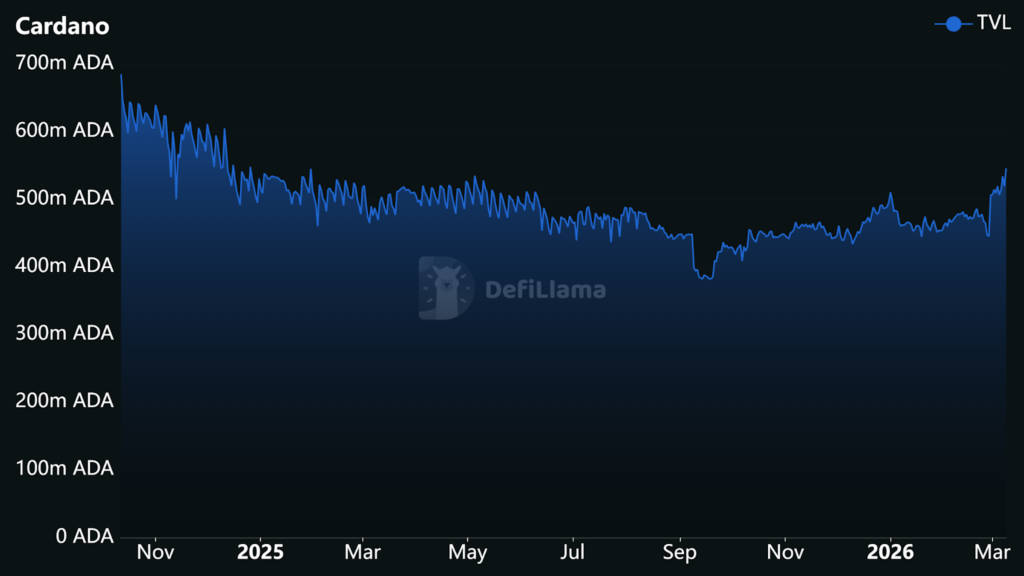 Los datos de DeFiLlama muestran que el TVL de Cardano ha aumentado a 545 millones de ADA, su nivel más alto desde finales de enero de 2025. Este aumento suele indicar que más usuarios están bloqueando tokens ADA en la blockchain para gestionar transacciones. Por lo tanto, este aumento podría reducir la oferta de ADA en los exchanges y provocar un aumento de precio si la demanda también aumenta.
