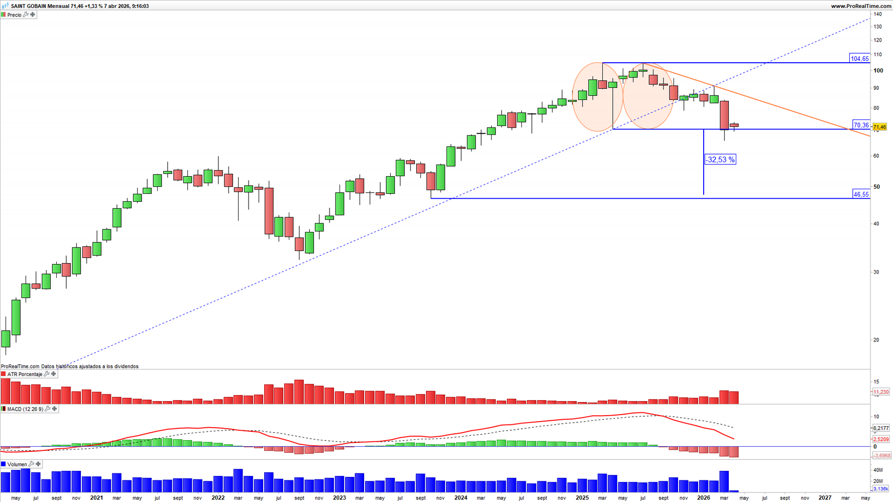 En el mercado europeo detectamos un activo que ha registrado un cierre mensual negativo. En las acciones de Saint Gobain (SGO), detectamos que el activo bajo estudio ha activado recientemente una figura chartista de distribución e implicaciones bajistas en forma de doble techo. De este modo, tras registrarse el cierre mensual de marzo por debajo de los 70,36€ por acción entra en juego un objetivo bajista de aproximadamente un 32,53% desde el punto de ruptura lo que podría provocar un retroceso en las acciones de Saint Gobain con ataques a las inmediaciones de los 46,55€ por acción siendo este un área de soporte de largo plazo. Por tanto, mantendremos la actitud negativa para Saint Gobain de cara a las próximas semanas / meses. Además, la ruptura del nivel de soporte ha venido acompañada de un importante incremento en el volumen de contratación dándole mayor validez a la misma.