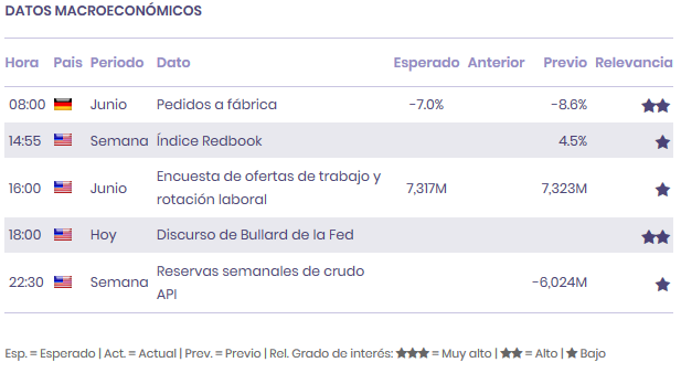 Más allá de Europa, en EEUU se conocerá el Índice Redbook de ventas minoristas, mensual y anual, la Encuesta JOLTs de ofertas de emplo del mes de junio y la cifra de reservas semanales de crudo del API.