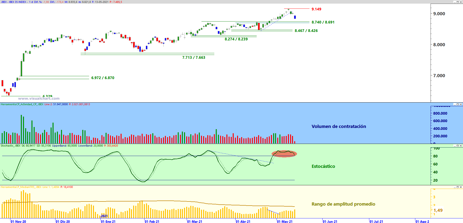 Ibex 35 en gráfico diario con Actividad de contratación (ventana con fondo azul), oscilador Estocástico (ventana con fondo verde) y Rango de amplitud medio (ventana con fondo amarillo)