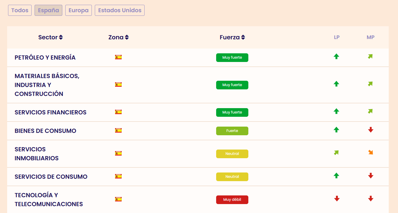 No lo sabemos, pero si miramos los sectores fuertes en este momento en bolsa según los indicadores premium de Estrategias de Inversión. En España vemos que energía, banca y materiales básicos siguen muy fuertes y con tendencia alcista en este momento.